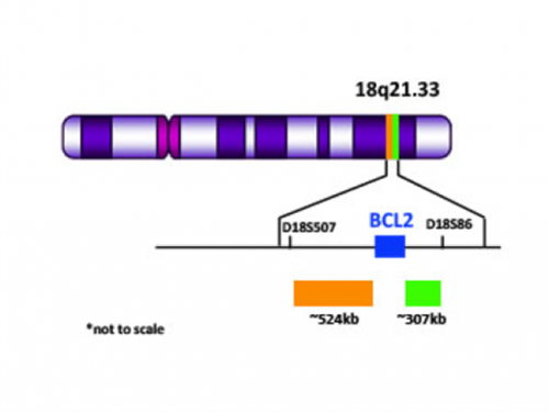 The BCL2 break apart probe is designed to detect chromosomal rearrangements involving the BCL2 gene on chromosome 18. The BCL2 gene is a proto-oncogene that encodes an anti-apoptotic signaling protein1. The BCL2 gene rearrangement is considered one of the hallmark cytogenetic abnormalities associated with B-Cell lymphomas 1. Follicular lymphoma, a B-Cell lymphoma subtype, is strongly characterized by gene rearrangements involving the BCL2 gene and the immunoglobulin heavy-chain (IGH) gene2. This genetic rearrangement results in the constitutive activation of the BCL2 gene and is considered one of the gene abnormalities that drives Follicular lymphoma pathogenesis3. Conventional cytogenetic techniques such as fluorescent in situ hybridization (FISH) can be utilized to detect gene arrangements involving the BCL2 gene.