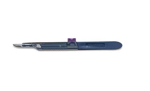 Safeshield är en säkerhetsskalpell med ett skyddande plasthölje för bladet. Höljet kan enkelt öppnas och stängas med en hand. Skalpellerna är sterila.