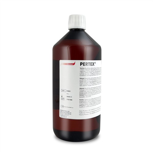 Låg viskositet (men Pertex for Automated coverslipping har lägre vilket gör att den är ännu mer lättflytande). Hållbarhetstiden gäller under förutsättning att kemikalierna förvaras på rätt sätt. Svalt och mörkt ( d v s ej i direkt kontakt med solljus) i väl tillslutna förpackningar. Så fort de har blivit öppnade reagerar kemikalierna med luft. Xylenet i lösningen dunstar efter lång förvaring och kan ge en mer trögflytande lösning.