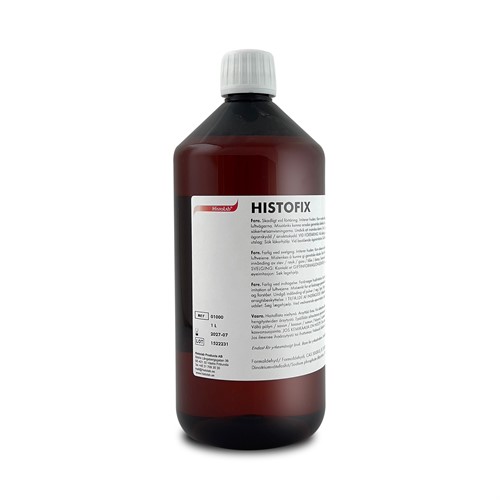 Histofixet innehåller 6% buffrad formaldehydlösning, pH 7,2 +/-0,2. Produkten har ställt osmotiskt tryck som bibehåller vävnadsstrukturer bättre än den vanliga 4% buffrade formaldehydlösningen. Histofixet är hållbar i 5 år från tillverkningsdatum i obruten förpackning. Buffer med natriumfosfatsalter och kaliumfosfatsalter. Efter fixering i Histofix: Skölj i rinnade vatten som formalin (några minuter) för att få bort salterna.